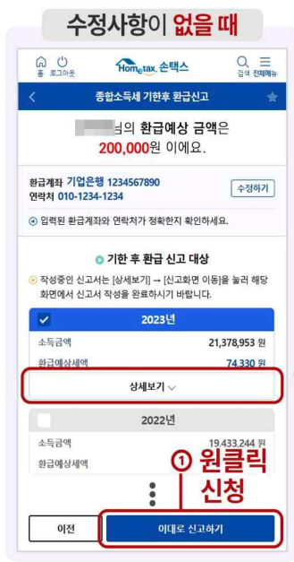 - 환급금액을 확인하고 수정 사항이없으면 ‘이대로 신고하기’ 버튼을 눌러서 한 번에 신청