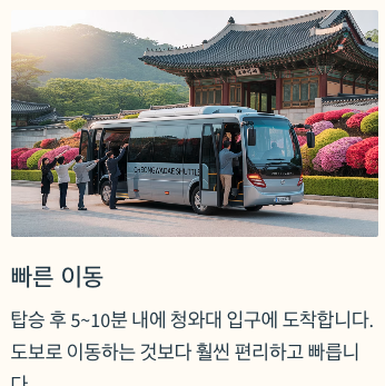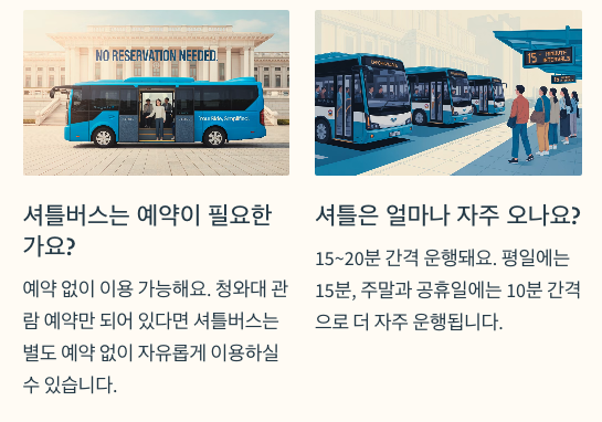 셔틀버스는 청와대 인근 주차장과 관람 입구를 연결해주는 무료 이동 수단이에요. 도보로 접근이 어려운 분들이나 가족 단위 관람객에게 매우 유용하게 활용되고 있어요. 매일 정해진 시간에 일정 간격으로 운행되며, 누구나 탑승 가능하답니다.