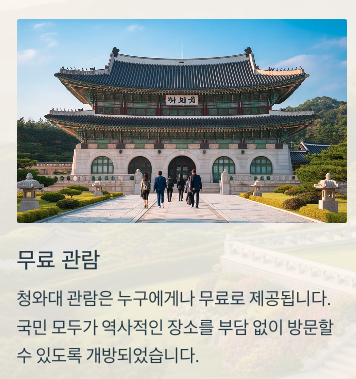 청와대는 이제 국민 누구나 자유롭게 관람할 수 있는 역사적 장소로 탈바꿈했어요. 아름다운 풍경과 역사적인 건물들을 둘러볼 수 있으며, 계절마다 바뀌는 정원의 풍경도 볼거리랍니다. 관람은 사전 예약을 통해 진행되며, 셔틀버스를 이용하면 보다 편리하게 접근할 수 있어요.